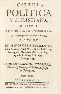 1666. ALBORNOZ, DIEGO FELIPE DE: CARTILLA POLITICA Y CHRISTIANA OFRECELA A LOS PIES DEL REY NUESTRO SEÑOR ... Madrid: M. Sanchez, 1666 a costa de Mateo de la Bastida. 8º mayor. 1 h. +7 h. + 179 p., 24 h. Enc. pergamino de época. Buen estado de...