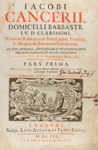 1670. (DERECHO). IACOBI CANCERII DOMICELLI BARBASTR. I.U.D. CLARISSIMI VARIARUM RESOLUTIONUM IURIS CAESAREI, PONTIFICII, & MUNICIPALIS PRINCIPATUS CATHALONIAE. Lugduni: Laur. Arnaud et Petri Borde, 1670. 2 vols. en folio. I: Portada a dos tintas con...