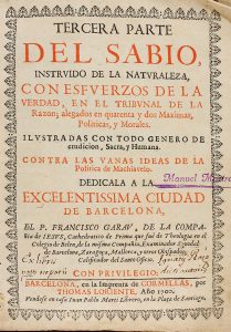 1700. (HUMANIDADES). GARAU, FRANCISCO: TERCERA PARTE DEL SABIO INSTRUIDO DE LA NATURALEZA CON ESFUERZOS DE LA VERDAD, EN EL TRIBUNAL DE LA RAZON. Barcelona: Imp. de Cormellas, 1700. 8º mayor. 5 h. + 531 p., 6 h. Bellas viñetas grabadas al cobre....