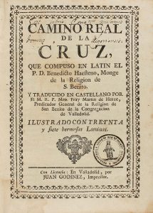 1721. (RELIGION). HAESTENO, BENEDICTO: CAMINO REAL DE LA CRUZ. Trad. Fray Martin de Herze. Valladolid: por Juan Gondinez impressor, 1721. 8º. 16 h. + 266 p., 3 h. Ilustr. con 37 grabados xilográficos, con orla floral. Enc. de época en pergamino,...