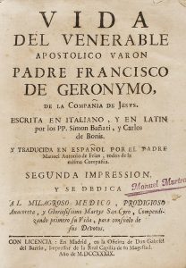 1739. (RELIGION). BAÑATI, SIMON; BONIS, CARLOS DE: VIDA DEL VENERABLE APOSTOLICO VARON PADRE FRANCISCO DE GERONYMO, DE LA COMPAÑIA DE JESUS. Madrid: Oficina Don Gabriel del Barrio, 1739. 8º mayor. 8 h. + 689 p., 3 h. Texto a dos columnas. Papel...