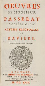 1695. (LITERATURA). PASSERAT: OEUVRES DE MONSIEUR DE PASSERAT DEDIEES A SON ALTESSE ELECTORALE DE BAVIERE. La Haye: chez Henry van Bulderen, 1695. 12º. 302 p. Incluye 7 obras de teatro, y aunque la paginación es correlativa, cada una de ellas...