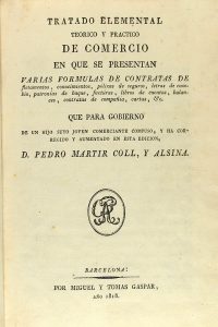 1818. (COMERCIO). MARTIR COLL ALSINA, PEDRO: TRATADO ELEMENTAL TEÓRICO Y PRÁCTICO DE COMERCIO. Se presentan varias fórmulas de contratas de fletamentos, conocimientos, pólizas de seguros, letras de cambio, patronías de buque, facturas, libros...