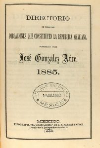 1885. (MÉXICO). GONZALEZ ARCE, JOSÉ. DIRECTORIO DE TODAS LAS POBLACIONES QUE CONSTITUYEN LA REPUBLICA MEXICANA. Formado por…. México: Tipografía ´El gran libro´. De J.F. Parres y Comp. 1885. 8º mayor. 233 p. Enc. en media piel.