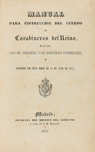 1844. (MILITARIA). PORTEFAIX, DOMINGO: MANUAL PARA INSTRUCCION DEL CUERPO DE CARABINEROS DEL REINO. Madrid: Imp. del Boletín del Ejército 1844. 8º.358 p., 2 h. Enc. en pasta española.