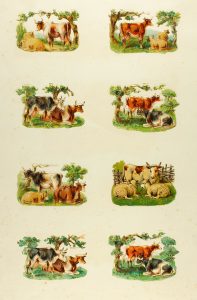 1880 ca. CONJUNTO DE 85 TROQUELADOS CROMOLITOGRAFICOS, LA MAYORIA ANIMALES DE GRANJA. Buen estado de conservación.