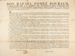 1805. (CUBA). CARTEL SOBRE LA FUGA DE CAPITALES DE LA ISLA DE CUBA Y SU PROHIBICION DE EXPORTAR PLATA POR ENCIMA DE 200 DOLARES. Dado en La Habana, 1º Mayo de 1805. 54x44 cm.