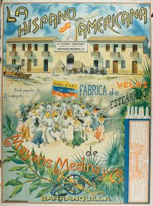 1880 ca. (PUBLICIDAD-CUBA). LA HISPANO-AMERICANA. FABRICA DE VELAS ESTEARICAS. MAYANS MEDIA y Cª. Barraquilla. Iluistrado con el edificio de la fábrica y una representación del baile popular de Barraquilla. Litografía a color. 53x39,5 cm. A -....