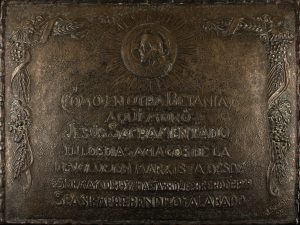 1939. COMO EN OTRA BETANIA AQUI MORO JESUS SACRAMENTADO EN LOS DIAS ACIAGOS DE LA REVOLUCION MARXISTA. Placa de metal, 26x34 cm. Placa en agradecimiento a una familia que guardó una imagen de Jesús durante el periodo de la guerra civil.