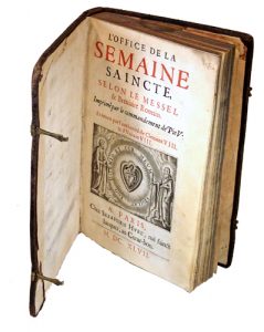 [Anonyme]. L'Office de Semaine Saincte selon le Messel et Breviaire romain, Paris, S. Huré, 1647. Fort in-8 rel. pl. cuir., 488 p. Dos à nerfs muet, encadrements à froid avec écoinçons sur les plats, fermoirs en laitons. Exemplaire entièrement...