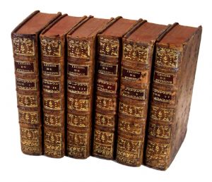 et bien complet de ses 116 belles planches rempliées. Elles représentent les instruments du cabinet de physique que Nollet utilisait pour ses expériences spectaculaires qui émerveillaient les esprits curieux du temps. D’intéressantes notes manuscrites et savantes, contemporaines de l’édition, commentent quelques pages des premiers volumes. Le cuir est un peu frotté avec des pertes aux pièces de titre et de tomaison et les coiffes élimées, défauts mineurs, bon exemplaire