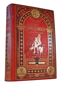 MALOT (Hector). Sans Famille, Paris, J. Hetzel, s.d. (1883). Gd in-8, cart. polychrome. Illustration d’Emile Bayard dans le texte et 20 pl. h.t. Plaque représentant Rémi avec sa harpe et son caniche, bords biseautés. Plat postérieur de type...