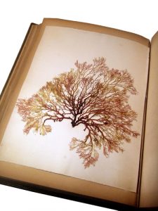 mineures. Les spécimens ne sont pas nommés mais ce travail de collecte est intéressant tant sur le plan scientifique qu’esthétique. Reliure plein cuir titrée Algues marine au dos, fleur-de-lys dans les caissons, gardes de velours, travail de dentelle dorée et d’estampage à froid au revers des plats, tranches dorées. Reliure usée avec un mors superficiellement fendu