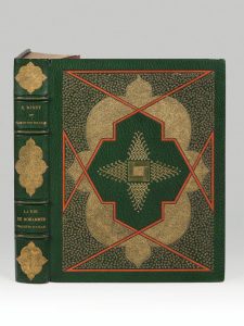 de maroquin rouge, guirlande florale mosaïquée dans un encadrement de disques du même goût, garde de soie rouge, tranches dorées, chemise et étui (Reliure de l’époque). Édition originale, ornée de 11 en-têtes à pleine-page en couleurs et à l’or de Mohammed Racim et 35 compositions en couleurs d’Étienne Dinet. Se référant aux doctrines musulmanes, les auteurs évoquent les moments les plus marquants de la vie du prophète. Chaque chapitre est introduit par une citation du Coran calligraphiée. Un des 100 exemplaires sur Japon avec une suite en noir.