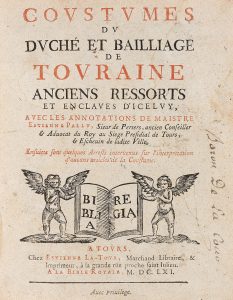 [touraine / Coutume - pallu]. Coustumes du duché et bailliage de Touraine [.]. Avec les annotations de Maistre Estienne pallu [.]. à Tours, Chez Estienne La Tour, 1661. Petit in-4°, basane, dos à nerfs orné (reliure de l’époque). reliure...
