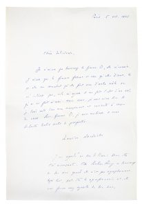Bardèche Maurice (1907-1998). lettre autographe signée, Paris 5 octobre 1975, à Régine Deforges ; 1 page in-4, enveloppe. Curieuse et galante lettre, au sujet du livre d’entretiens de Régine Deforges avec Pauline Réage (Dominique Aury), O...