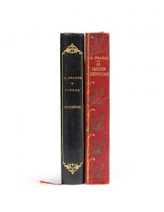 France (Anatole). le Jardin d’epicure. Paris, Calmann Lévy, 1895. In-12, bradel demi-maroquin cerise, dos lisse orné d’un décor de feuillage mosaïqué, tête dorée, couvertures et dos conservés. Edition originale : un des 50 exemplaires sur...