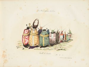 tirage, sauf pour neuf d'entre elles qui sont en second tirage. L'exemplaire renferme deux planches censurées, publiées par Borella à Bruxelles en 1830 : la Famille de scarabées, une charge anticléricale représentant une procession de Jésuites, et Une bête féroce, ou un ami de la Gazette caricaturant le conflit ensanglantant alors la Grèce et la Turquie. Cette planche, non numérotée, remplace la planche 62, qui manque (Un mariage suivant la nature). L'exemplaire est complété par une planche extraite de La Silhouette pour laquelle Granville composa neuf caricatures dont celle-ci, intitulée La Revanche, ou les Français au Missouri : lors d'une vente aux esclaves, ce sont des Européens qui sont proposés aux indigènes. Les planches n°33 à 35, 37 à 41 et 43 proviennent d'un second tirage, réalisé en 1829 et légendé en français et en anglais. album phare de la période romantique et chef-d'œuvre des recueils d'animaux anthropomorphes. “On ne saurait exagérer l'importance des Métamorphoses du jour. Elles constituent le premier grand succès de Grandville et annoncent trois aspects majeurs de son œuvre : la fantaisie, la satire morale et la caricature politique (^) Grandville agreffé des têtes d'animaux sur des corps humains avec tant d'habileté que ces êtres monstrueux semblent véritablement vivants. Ce don exceptionnel de représenter l'invraisemblable comme une vérité absolue marque toute son œuvre fantaisiste (^) C'est un phénomène qui afrappé ses contemporains et qui nous surprend toujours, faisant de Grandville un des maîtres de l'imaginaire, précurseur d'Odilon Redon et des surréalistes” (Clive F. Getty). Cartonnage frotté, rousseurs.