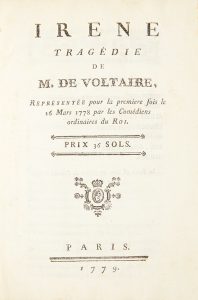 Voltaire. irène. Tragédie représentée pour la première fois le 16 mars 1778 par les comédiens ordinaires du Roi. Paris, 1779. In-8, demi-basane ancienne, dos muet. Première édition. C’est lors de la sixième et avant-dernière...