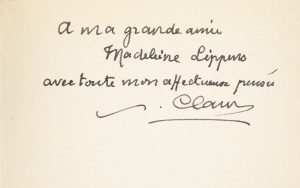 numéroté sur papier d'alfa. Couverture déchirée.. Claudel (Paul). Les Aventures de Sophie. Paris, Gallimard, 1937. In-12 broché. Edition originale : exemplaire du service de presse. Envoi autographe signé à Madeleine Lippens.. Claudel (Paul). Discours et Remerciements. Paris, Gallimard, 1947. In-12 broché. Edition originale. Envoi autographe signé à Marcel Arland.