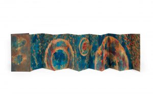 Blaquiere (Roger). Petit mandala de poche. 1988. Livre unique composé par l’artiste Roger Blaquière : il se compose d’une peinture sur un feuillet gaufré, plié en accordéon, qui mesure déplié plus d’un mètre de long, et se présente...