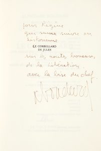 rencontré lors de la publication de La Métamorphose des cloportes, livre que je vendais à la librairie du Drugstore des Champs-Elysées. Par la suite, je lus tous ses livres avec gourmandise. (.) amontmorillon, dans la Cité de l'écrit et des métiers du livre, un square porte son nom. Chaque fois que je passe devant la plaque, j'effleure de mes doigts chacune des lettres de son nom en souriant du bon tour qu'il ajoué aux bourgeois et aux gens honnêtes de la petite ville qui se seraient détournés de lui si la littérature n'avait pas redoré le blason de l'ex-taulard” (Deforges, Le Paris de mes amours, pp. 48-49). Fraternel envoi autographe de l'auteur « Pour Régine, qui saura suivre en historienne ce Corbillard de Jules sur les routes boueuses de la libération. Avec la bise du chef » On joint du même :. Le Café du pauvre. Roman. Paris, La Table ronde, 1983. In-8 broché. Edition originale : un des 30 exemplaires sur vergé chiffon de Lana (n° XVII), seul grand papier avec quelques exemplaires hors commerce. . Les Sales mômes. Pièce en deux actes. Paris, La Table ronde, 1983. In-12 broché. Edition originale : un des 20 exemplaires sur vergé chiffon de Lana (n° XII), seul grand papier avec quelques exemplaires hors commerce. . La Fermeture. 13 avril 1946 : la fin des maisons closes. P., Laffont, 1986. In-8 broché. Edition originale (il n'y a eu que 25 grands papiers). Envoi autographe signé au docteur Laure Jablon.