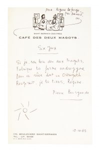 en-tête du Café des Deux Magots à Paris) : Six Jeux / Si je, non loin des deux Magots / Fabrique ta forme androgyne / Dans un rêve dont un Ostrogoth / Rougirait, je te tiens, Régine