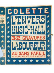 Colette. l’envers du music-hall. Paris, Au Sans Pareil, 1926. In-4 broché, couvertures rempliées, chemise éditeur. Première édition illustrée : 32 burins originaux de Laboureur, dont 2 hors texte. Un des 350 exemplaires sur vergé de Rives....