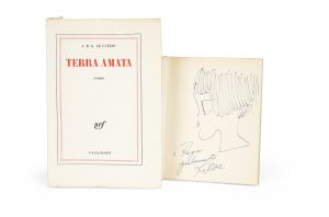 où Beaumont fit connaissance avec sa douleur. Paris, Mercure de France, 1964. In-16 carré broché, couvertures rempliées. Edition originale : exemplaire numéroté sur vélin Clefcy des papeteries Prioux. Dessin et envoi autographe signés de Kiraz, le créateur des personnages des « Parisiennes », à Régine Deforges : « A Régine, goulument ». . Terra amata. Paris, Gallimard, 1967. In-8 broché. Edition originale : un des 156 exemplaires sur vélin pur fil Lafuma-Navarre, second papier après 36 Hollande (n° 138). . L'Extase matérielle. Paris, Gallimard, 1967. In-8 broché. Edition originale : un des 156 exemplaires sur vélin pur fil Lafuma-Navarre, second papier après 36 Hollande (n° 47). . Le Rêve mexicain ou la Pensée interrompue. Paris, Gallimard, 1988. In-8 broché. . Onitsha. Roman. Paris, Gallimard, 1991 . In-8 broché. . Hasard. Suivi de Angoli Mala. Romans. Paris, Gallimard, 1 999. In-8 broché. Edition originale : un des 90 exemplaires sur vélin pur chiffon de Lana, seul grand papier (n° 88).