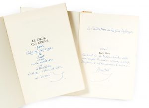 Deforges : « Voici Lady Black du haut de ses talons hauts, elle contemple les autres romans à venir, toujours le même, jamais le même ». Insérée dans le volume, une lettre autographe signée « Yves », adressée à Régine Deforges le 27 juillet 1977 (2 p. in-4, enveloppe). Lettre amicale sur le thème de l'hermine, « sorte de clef, de signe », qu'il aglissée dans un récit que Pauvert a l'intention de publier ; et sur son programme de vacances. On joint, du même, un ensemble de 8 ouvrages, tous, sauf un, sur grand papier :. Evolène. Roman. Paris, Flammarion, 1972. In-12 broché. Edition originale : un des 30 exemplaires sur vélin alfa, seul grand papier (n° 11).. Les Loukoums. Paris, Flammarion, 1973. In-8 broché. Edition originale : un des 30 exemplaires sur vélin alfa, seul grand papier (n° 6). . Le Cœur qui cogne. Roman. Paris, Flammarion, 1974. In-8 broché. Edition originale : un des 30 exemplaires sur vélin alfa (n° 33), seul grand papier avec 20 pur fil Arches. Envoi autographe paraphé à Régine Deforges, « de tout cœur avec émotion & attention / écrire : crier et rire ». . Killer. Roman. Paris, Flammarion, 1975. In-8 broché. Edition originale : un des 30 exemplaires sur vélin alfa (n° 20), second grand papier après 20 vélin pur fil. . Niagarak. Paris, Grasset, 1976. In-8 broché. Edition originale : un des 29 exemplaires sur vergé de Lana (n° 5), seul grand papier. Envoi autographe paraphé de l'auteur à Régine Deforges. . Théâtre II. Paris, Flammarion, 1976. In-8 broché. Edition originale : un des 25 exemplaires sur vélin alfa (n° 2), seul grand papier. . Le Petit galopin de nos corps. Roman. Paris, Laffont, 1977. In-8 broché. Edition originale : un des 30 exemplaires sur vélin chiffon de Lana (n° 22), seul grand papier. . Poudre d'or. Roman. Paris, Flammarion, 1 993. In-8 broché, jaquette. Edition originale : exemplaire du service de presse. Envoi autographe paraphé.