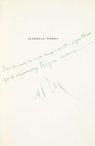 Pieyre De Mandiargues (André). isabella morra. Pièce en deux actes. Paris, Gallimard, 1973. In-12 broché. Edition originale : exemplaire du service de presse. Bel envoi autographe signé faisant allusion à la maison d’édition créée par...