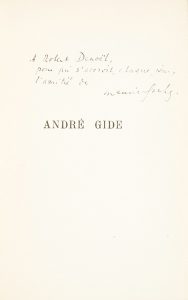 Sachs (Maurice). andré gide. Paris, Denoël et Steele, 1936. In-12 broché. Edition originale : un des 20 exemplaires sur papier pur fil (Hc n° Vi), seul grand papier après 8 Hollande. Envoi autographe signé « à Robert Denoël, pour qui...