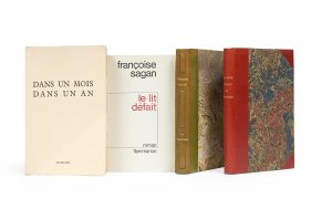 Sagan (Françoise). ensemble de 4 ouvrages.. Dans un mois, dans un an. Paris, Julliard, 1957. In-8 broché. Edition originale : un des 90 exemplaires de tête sur Hollande Van Gelder (n° 57).. La Chamade. Roman. Paris, Julliard, 1965. In-8...