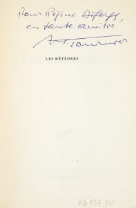 Tournier (Michel). ensemble de 3 éditions originales, en service de presse, avec envois autographes signés de l’auteur à Régine deforges.. Les Météores. Paris, Gallimard, 1975. In-8 broché. Feuillet d’annonce et bandeau conservés.. Le...