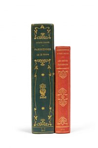 l'égoïsme masculin. Ménagères, ouvrières et courtisanes, bourgeoises et mondaines, artistes et comédiennes. Paris, Mercure de France, 1910. In-8, demi-chagrin vert, dos lisse orné, tête dorée, couverture et dos conservés, non rogné (Dervois). Edition originale : un des 12 exemplaires sur Hollande, seul grand papier (n° 4). On joint :. Delvau (Alfred). Les Heures parisiennes. 25 eaux-fortes d'Emile Benassit. Paris, Marpon et Flammarion, 1882. In-16 carré, demi-chagrin rouge à coins moderne, dos lisse, tête dorée. Seconde édition. La planche « Minuit » est avec le petit amour, rétabli après la censure de l'édition originale de 1866. Mouillure angulaire marginale.