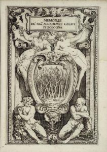 Landwehr, Romanic, n°8. — Praz, 245. Première édition, illustrée d’un titre-frontispice, d’un titre gravé, de 32 portraits et de 71 emblèmes gravés dans le texte par Lorenzo Tinti, dont 2 à pleine page. L’Académie Gelati, établie à Bologne depuis la fin du seizième siècle, acquit une grande réputation dans toute l’Europe. L’ouvrage consiste en une galerie biographique de chacun des académiciens, avec leurs qualités et leurs travaux, leur emblème et leur portrait. 003-r.jpg