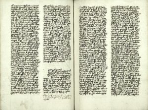 Manuscrit latin des xive et xve siècles. Papier. 221 ff. (298 x 214 mm), non foliotés, 2 colonnes par page ; réglure à l’encre brune. á l’origine, ce manuscrit a été monté sur 4 nerfs fendus, ce qui montre l’ancienneté de la sa constitution ; tranchefiles constituées d’un fil brodé sur une âme simple. La reliure a été refaite au début de l’époque moderne par l’addition d’un simple carton recouvert d’un défet tiré d’un ouvrage en allemand. COMPOSITION. 19 cahiers de 12 ff. - Les titres et initiales manquent. - Les feuillets extrêmes manquent, ce qui rend vaine l’étude historique du manuscrit. Ce volume se présente comme un recueil bien établi mais, en y regarder de près, il existe de nombreuses disparités. Il y a 3 ensembles distincts : 1) sur le premier figure le traité des Vices et des vertus de Guillaume Perrault ; 2) en fin de volume, est relié un commentaire des Sentences de Pierre Lombard attribué à Bonaventure, dont les derniers feuillets ont été utilisés pour porter les épîtres de saint Paul aux Romains et aux Corinthiens. 3) entre ces deux piliers, on a glissé deux cahiers portant divers traités, dont le De miseria conditionis humanae de Lothaire, futur pape Innocent III. L’ensemble du volume est écrit sur papier et sur deux colonnes. Il n’y aucun titre autre que ceux qui ont été portés dans les marges par un annotateur plus tardif (XV e s.) ; aucune initiale n’a été dessinée ou peintes bien que l’espace pour les recevoir ait été réservé. Mais chaque ensemble — voire chaque œuvre — a reçu une mise en page un peu différente, et une écriture très typée : 1) I 9(12—3) les 3 premiers fol. manquent engendrant une lacune textuelle (f. 1-9), II12-XI12 (f. 10-129), XII9(12—3) les 3 derniers fol., inutilisés, ont été coupés (f. 130-138). Deux systèmes de signatures se suivent, les premiers cahiers signés « Primus », II-III signés « Secundus et Tercius » à gauche dans la marge sup. du 1 er fol ; puis l’on passe à une signature en chiffres romains au centre de la marge sup. du 1er fol. du cahier (« VI », puis « VIII » à « XII »). L’écriture est sur 2 colonnes (228 x 70/72 mm) de 42/43 lignes ; entrecolonnes de 15 mm. Écriture très épaisse ; titres d’une encre plus pâle portés dans les marges d’une autre main (XV e s.). 2) XIII 12-XIV12, soit 2 cahiers non signés (f. 139-162) : 40 lignes par colonnes (68 et 72 x 240 mm) ; entrecolonnes de 18 mm. ; deux mains, l’une fine et déliée, l’autre plus relâchée, ont écrit le traité de Lothaire ; annotations marginales également de plusieurs mains. Le traité suivant est d’une main plus épaisse. Le dernier traité est écrit sur des colonnes de 54 lignes, d’une encre très claire, presque jaunissante : écriture bien formée portée sur un encadrement légèrement oblique. 3) XV 12-XIX12, soit 5 cahiers avec réclames (f. 163-221 + contregarde) ; piqûres ; 2 coll. (70/72 et 75 x 230 mm) de 50 lignes. Très belle écriture ronde et bien formée ; la numérotation des distinctiones a été portée postérieurement dans les marges. Les épîtres sont portées sur des colonnes (74 x 228 mm.) de 47 lignes. Le dernier fol. du dernier cahier est collé au contreplat inf. : il y a donc une lacune textuelle. CONTENU. I) - f. 1a-138v°a : GUILLAUME PERRAULT, Somme des vices et des vertus. f. 1a-56a : <Summa virtutum>. Inc.: // omni bono vacuus est. Unde de quodam Judeo, qui propter defectum hospitii in templo Apollinis ; des. (f. 56a) : tales etiam Christo societatem faciunt in vigilia presentis afflictionis, ideo merito erunt socii eius in festo eterne iocunditatis. f. 56b-137v°a : <Summa viciorum>. Inc.: Dictura de singulis viciis ante omnia ostendemus doctrinam perutilem esse per hoc, quod vicia summo studio et diligenter sunt vitanda ; des. (f. 138b) : Ultimo ad commendationum silentii potest valere judicium sapientis, locutum esse aliquando penituit, tacere vereo numquam... (f. 138v°a) : Silencium est signum mortis veteris hominis. Loquacitas in claustrali, qui debet esse mortuus est stupenda, sicut si videremus hominem mortuum loquentem. Religio ubi non observatur silentium potest dicere illud Iob XXX : « Quasi rupto muro et aperta ianua irruerunt super me. » — Guillelmi Peraldi,... Summae virtutum ac vitiorum T. I [-II], hac postrema editione a compluribus... mendis... quae passim occurebant, juxta exemplar charactere gothico impressum Basileae 1497 diligenter expurgatae… Lugduni : apud P. Compagnon et R. Taillandier, 1668. II) - f. 138a-152b : LOTHARIUS PORTUENSIS [postea Innocentius papa III]. De contemptu mundi sive de Miseria conditionis humanae. - Prol. : Domino Patri (…) Petro Dei gracia Portuensi episcopo, Lotharius indignus diaconus, gratiam in presenti et gloriam in futuro ; des. : ita ut per hoc humilietur clarus, ut per illud exaltetur. — < Caput primum. De miserabili humanae conditionis ingressu >. Inc. : Quare de vulva matris egressus sum, ut viderem laborem et dolorem : des. : Oblivio et confusio, tortiones et punctiones, amaritudines et terrores, fames et sitis, frigus et cauma, sulphur et ignis ardens, in secula seculorum. Amen. — (PL 217, col. 701-743). III) - f. 152v°a-162v°b : Deux commentaires sur les Sentences, dont les auteurs n’ont pu être identifiés. • (f. 152v°a-155a) : Inc. : Aperiam in parabolis os meum,et loquar propositiones, ab initio (Ps 77) ; des. : a quo omnia et finis ad quem ordinantur omnia, cui est honor et gloria (Stegmüller, RS 479). Et sic etiam lectura Bonaventure cardinalis quatuor librorum sententiarum Magistri abreviatis. • (f. 155b-162v°b) : Inc. : Nam incarnatio Filii Dei valde consolatoria. IV) - f. 163a-213v°b : BONAVENTURA , Lectura brevis Boneventure super Sententias < Petri Lombardi > (titre ajouté dans la marge sup.). - (f. 163a-173v°b) Inc. : Cupientes aliquid de penuria ; des. : diversis causis possunt sanctis placere et displicere. I