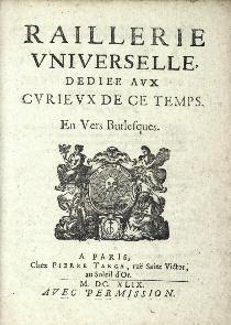 Belle réunion de pièces poétiques illustrant « la fureur du burlesque » alors en grande vogue. Mais il n’est qu’une forme particulière de la poésie réaliste, caricaturale et bouffonne qui, venue d’Italie, s’étale largement dans les nombreuses satires de Régnier, de ses contemporains et de ses successeurs (Daniel Mornet). L’ensemble contient : Coq-à-l’asne, ou lettre burlesque du sieur Voiture ressuscité, au preux chevalier Guischeus alias le mareschal de Grammont. Édition originale de l’une des pièces les plus spirituelles de la Fronde (Moreau, n°797). — Apparition merveilleuse de trois phantosmes dans la forest de Montargis à un bourgeois de la mesme Ville. Peu commun (Moreau, n°143). — ARGENVILLE (d’). Harangue burlesque, faite à Mademoiselle au nom des Batteliers d’Orléans, contenant le narré de son entrée dans la ville. Pamphlet spirituel et rare (Moreau, n°1543). — Les Maltotiers, ou pescheurs en eau trouble. En vers burlesques, langue normande. Les Pesqueux en yau trouble. Très rare pamphlet en patois normand (Moreau, n°2344). — Les Deux friperies, ou les drilles revestus. Raillerie en vers burlesques. Moreau, n°1066. — La Haine irréconciliable de la paix et de la guerre. En vers burlesques. Moreau, n°1538. — Lettre à l’abbé burlesque. Moreau, n°1810. — Le Pot pourry burlesque, de toute l’histoire de ce temps. Moreau, n°2830. — Les Sept arts libéraux de la cour. En vers burlesques. Moreau, n°3659. — Le Terme de pasques sans trébuchet, en vers burlesques. Moreau, n°3761. — Les Visages qui se démontent. En vers burlesques. Moreau, n°4034. — Le Politique burlesque dédié à Amaranthe. Moreau, n°2810. — La Déroute des partisans rôtis. En vers burlesques. Moreau, n°1051. — Paris debloqué ou les passages ouverts. Moreau, n°2692. — La Raillerie sans fiel ou l’innocent jeu d’esprit. Moreau, n°2958. — Raillerie universelle dédiée aux curieux de ce temps. Moreau, n°2960. — Le Retour et restablissement des arts et mestiers. Pièce qui n’est pas des plus communes, dans laquelle il y a de l’esprit et de la gaieté (Moreau, n°3533). — Le Sens dessus-dessous, ou le malheur universel de toutes les conditions. Moreau, n°3641. — Le Testament du diable d’argent, avec sa mort. Moreau, n°3765.