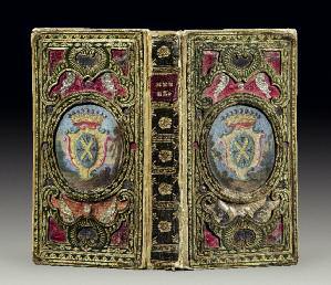 de filets et roulettes dorés réservant un médaillon central sous mica dans lequel figurent des armoiries peintes à la gouache sur un fond de paysage et de compartiments de forme chantournée, sous mica, couverts de paillons et ornés de feuilles d’acanthe, dos de maroquin vert avec pièce de titre rouge, doublure et gardes de tabis rose, tranches dorées (Reliure de l’époque). Vignette gravée sur le titre représentant saint Nicolas et 6 gravures dans le texte. Ravissante reliure mosaïquée, aux armes peintes indéterminées. Quelques petites rousseurs. Petits manques, bordure du médaillon central anciennement restaurée.
