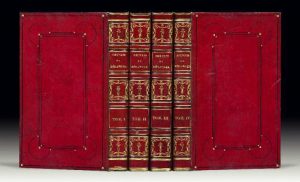 Béranger (P. J. de). Œuvres complètes, édition unique revue par l'auteur. Paris, Perrotin, 1834. 4 volumes in-8, veau framboise, filet d'encadrement noir avec petite rosace dorée aux angles, trois filets noirs ponctués de petites pastilles dorées