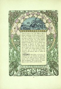 d’orchidée mosaïquée de maroquin lilas dans chaque cercle, dos orné d’un médaillon mosaïqué de maroquin fauve contenant une cloche dorée, répété, de petits ronds à froid, de filets et chaînettes dorés, pièce de titre fauve, bordure intérieure, tête dorée, non rogné, couverture et dos (V. Beaumont rel. Paris). Édition originale de ce beau livre Art Nouveau, ornée d’une couverture verte illustrée au pochoir et de 82 compositions et encadrements en couleurs par Alphonse Mucha. Tirage à 252 exemplaires, celui-ci un des 35 sur Japon, comportant une suite en noir sur Chine des 78 encadrements de texte.