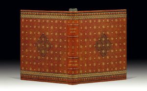 triangles dorés, large encadrement intérieur orné des mêmes motifs or et à froid, doublure et gardes de soie violette, doubles gardes, tranches dorées sur témoins, couverture, chemise demi-maroquin, étui (J. Chadel - E. Maylander). 31 compositions de Sylvain Sauvage, gravées en couleurs au repérage, avec la collaboration de D. A. Maillart. Tirage à 237 exemplaires, celui-ci un des 185 sur vélin de Montval spécial auquel on a ajouté une suite des gravures avant la lettre. On a joint la maquette de la reliure dessinée par Jules Chadel. De la bibliothèque Léon Givaudan (1988, n°105).