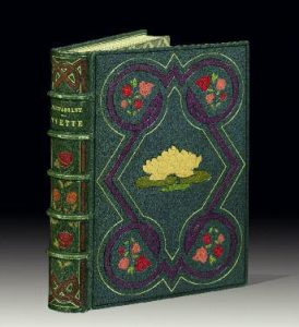 branche fleurie de roses mosaïquée dans les angles, nymphéa mosaïqué dans des tons de beige et de vert olive au centre, dos orné de filets dorés et listels bordeaux entrelacés et de quatre roses mosaïquées, encadrement intérieur orné d’un listel violet serti de deux doubles filets dorés et à froid, doublure et gardes de soie brochée, tranches dorées, non rogné, couverture et dos, étui (Noulhac 1913). 40 eaux-fortes originales dans le texte de Pierre Vidal. Tirage à 200 exemplaires, plus un exemplaire unique, celui-ci un des 175 sur papier vélin de Rives. EXEMPLAIRE DE PIERRE VIDAL, UNIQUE, COMPORTANT EN FRONTISPICE UNE AQUARELLE ORIGINALE À PLEINE PAGE, DATÉE 1912 ET LES 40 DESSINS ORIGINAUX AU CRAYON, AQUARELLÉS PRÉPARATOIRES. Intéressante reliure mosaïquée de Noulhac. Dos un peu passé.