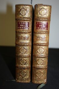 Code des Chasses...Paris, Saugrain, 1734, 2 vol. in-12 basane mouchetée (Bibliothèque de la Chasse, 829).