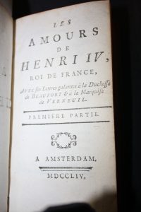 Les Amours d’Henri IV, Roi de France, avec ses lettres galantes à la Duchesse de Beaufort, & à la Marquise de Verneuil.Amsterdam, 1754, 2 parties en 1 vol. in-16 veau granité.