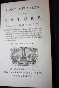 Bonnet (C.) :Contemplation de la Nature.Amsterdam, Rey, 1764, 2 tomes en 1 vol. in-8 basane fauve.