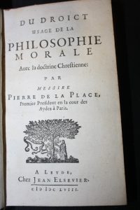 De la Place (Pierre) :Du droict usage de la philosophie morale avec la doctrine chrétienne.Leyde, Elzevier, 1658, in-12 basane.