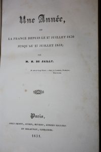 Jailly (H. de) :Une année ou la France depuis le 27 juillet 1830 jusqu'au 27 juillet 1831.Paris, Dentu, 1831 ; in-8 ; plein maroquin.