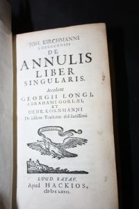 Kirchmannius (J.) :De Annulis Lieber.Leyde, Hackios, 1672, in-12 vélin, aux Armes.
