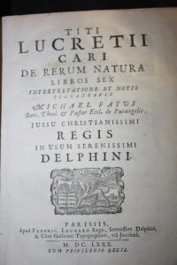 Lucrece :De Rerum Natura, in usum Delphini.Paris, Leonard, 1680, in-4 basane brune (épidermée).